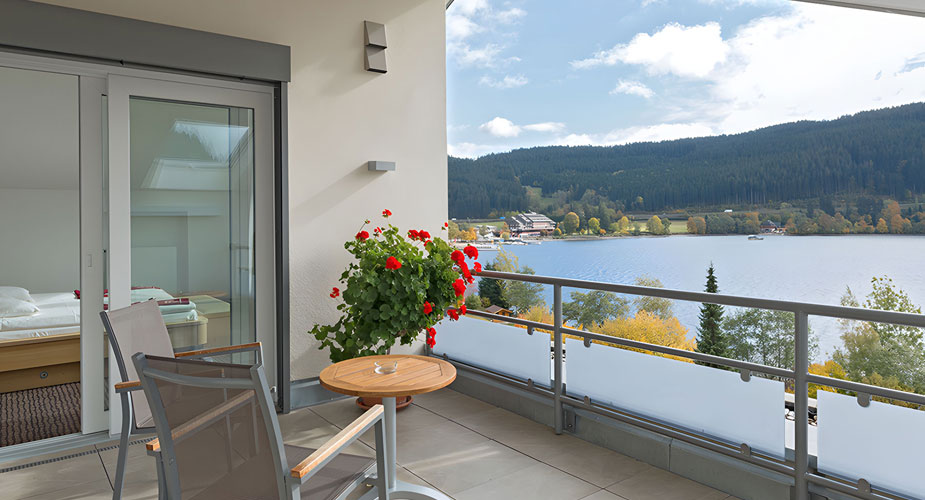 Die romantische Schönheit des Schwarzwalds, gebündelt in einer Suite. 70 Quadratmeter anspruchsvolles Ambiente. Schlafzimmer mit Panoramablick auf den See. Living Room mit Wohnecke, Heimkino, Nespressostation und Kühlschrank. Badezimmer mit begehbarer Dusche und Badewanne, Toilette separat. Verbringen Sie Ihre Zeit wetterunabhängig an der würzigen Schwarzwaldluft – auf der eigenen 18 Quadratmeter großen und überdachten Dachterrasse mit fotoreifer Aussicht.
