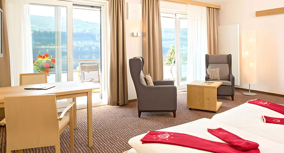 Vier Meter Raumhöhe, Belle Etage, vollständig verglaste Fensterfront zur Seeseite. Im See Deluxe Atelier Studio genießen Sie auf 40 bis 45 Quadratmetern Ihren Aufenthalt und erleben den Titisee von seiner malerischen Seite. Beim Aufwachen hinter Glasfront oder auf dem Panorama-Südbalkon.